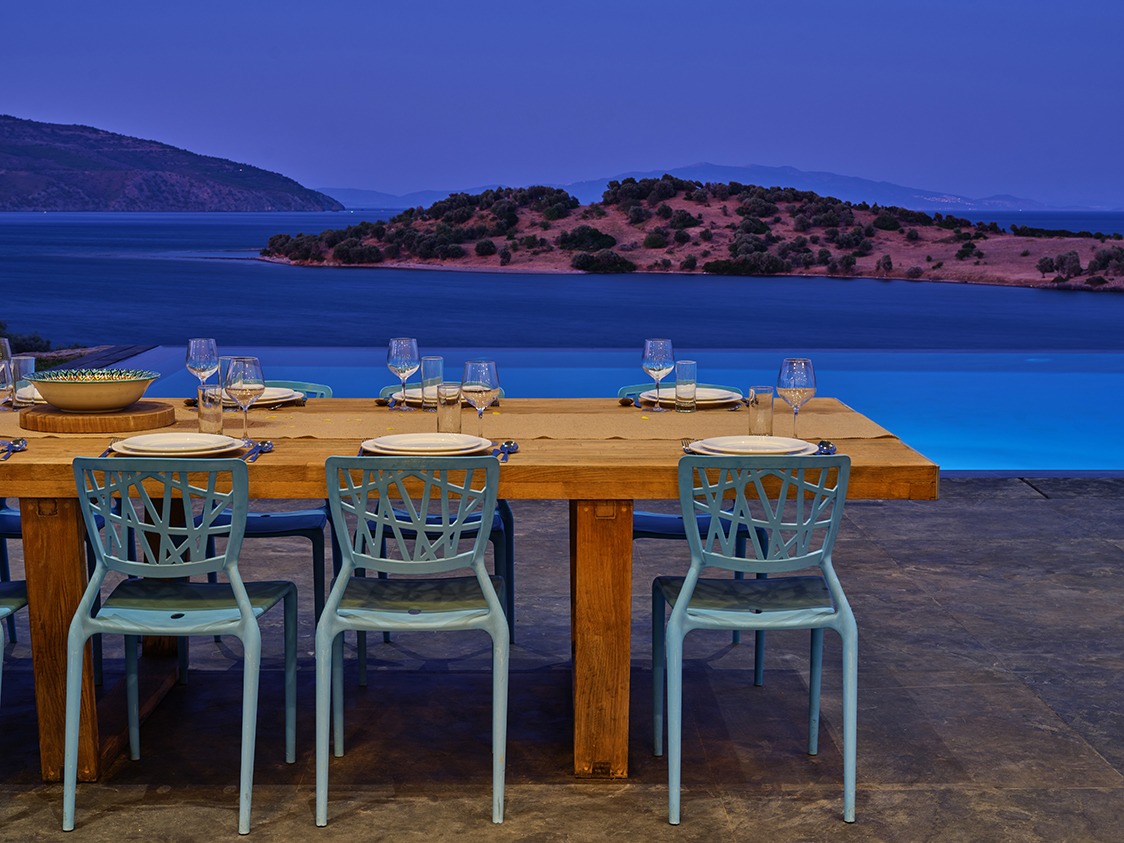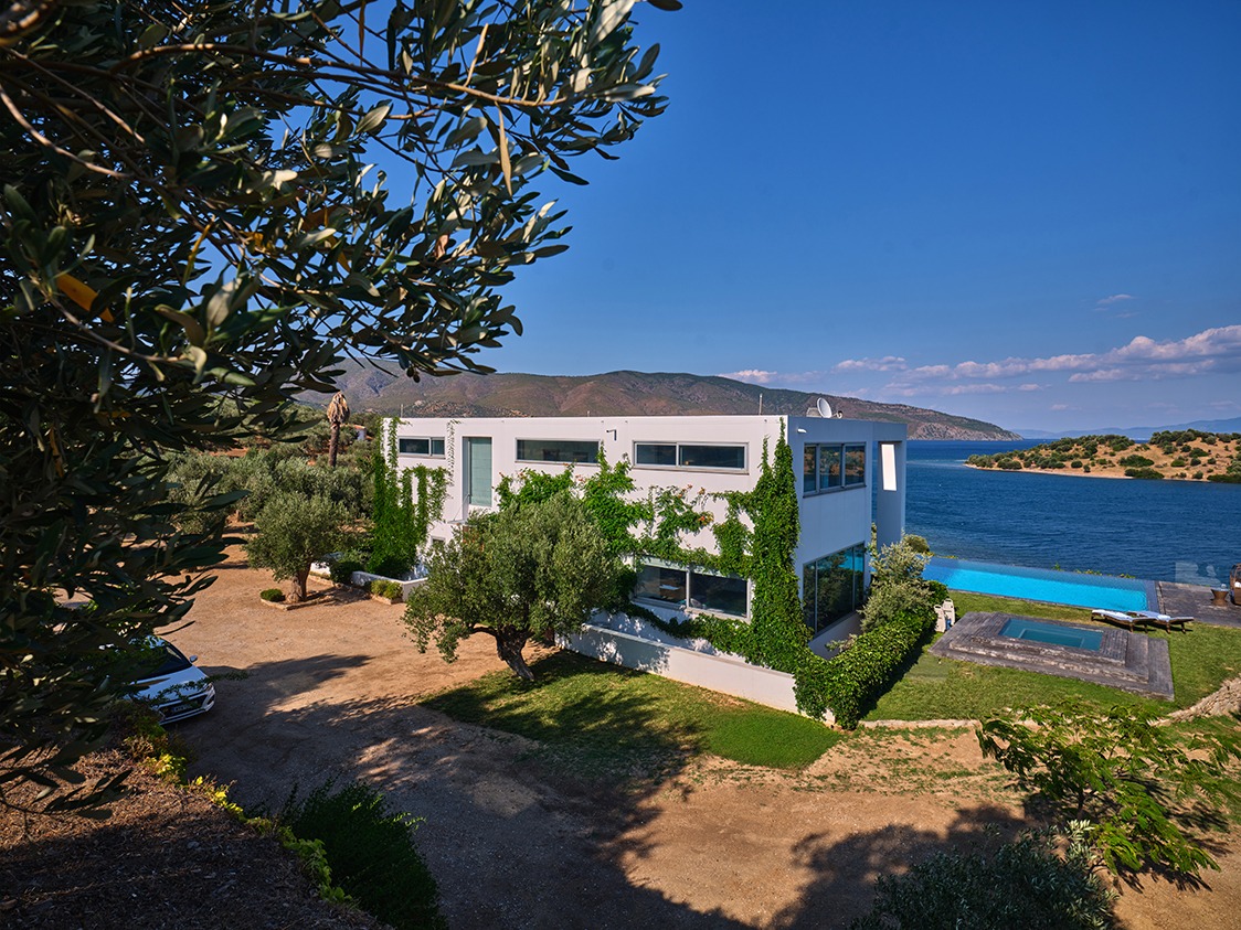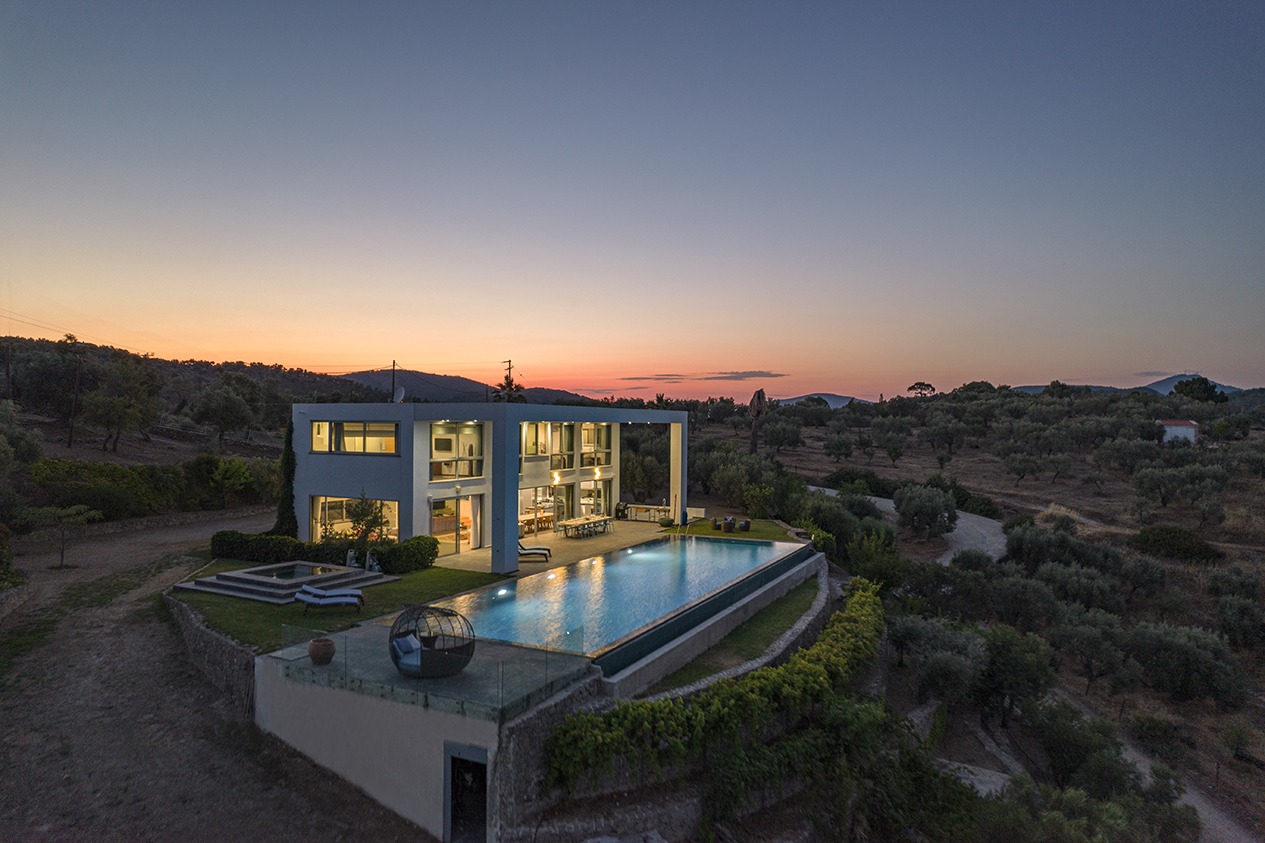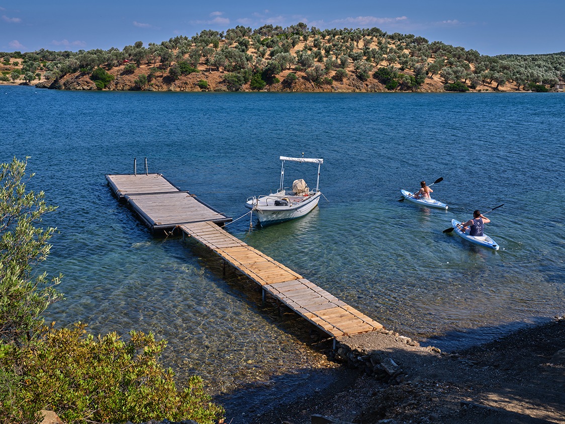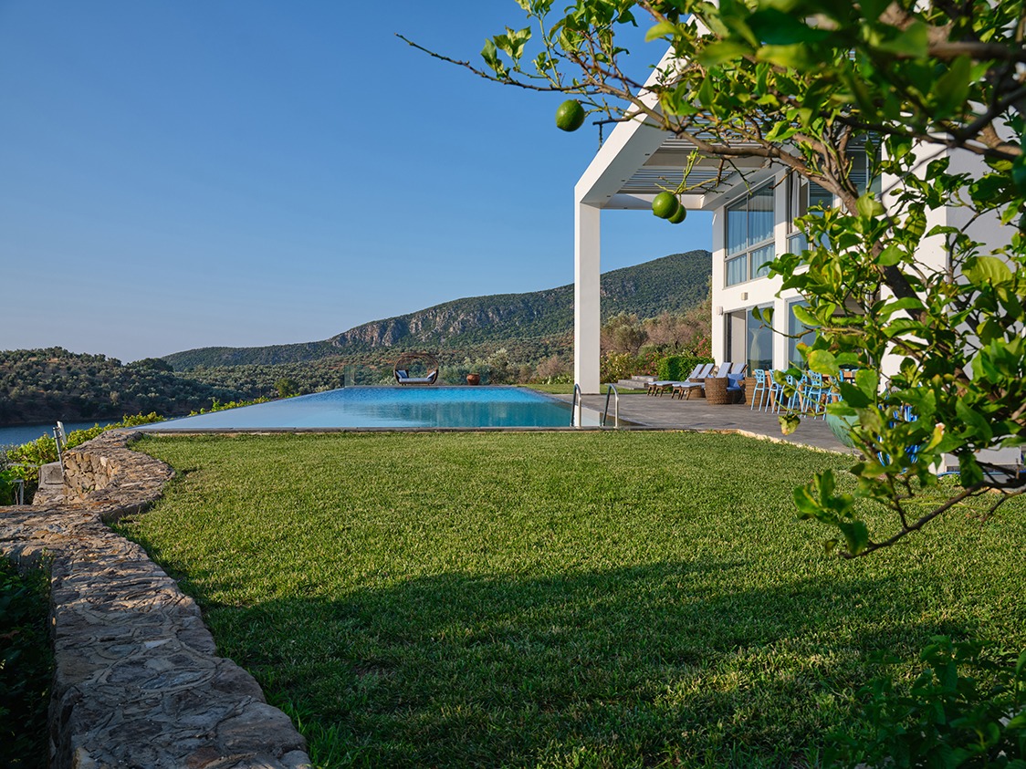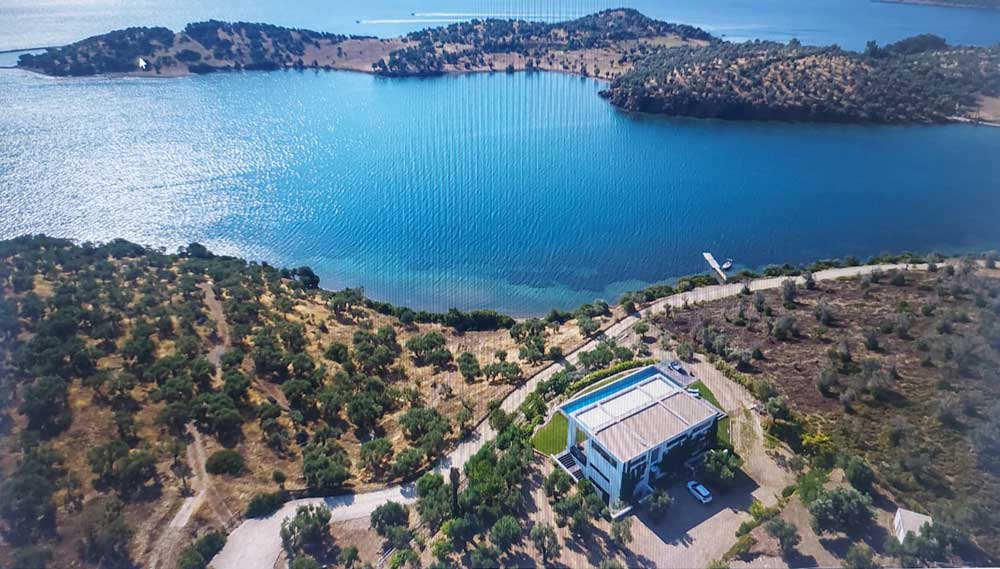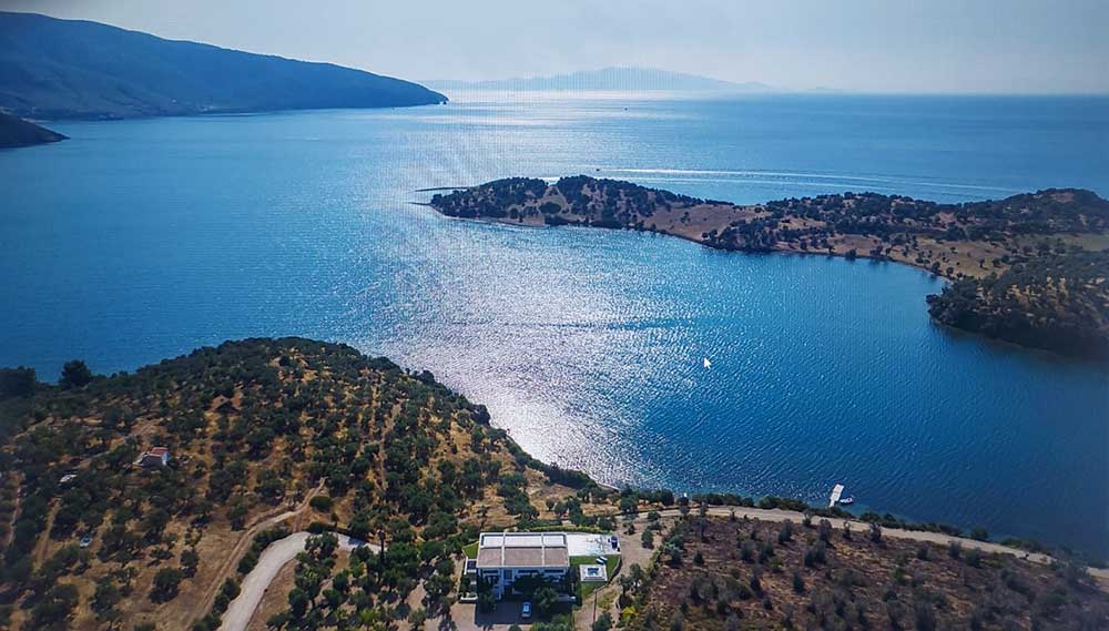 The villa is located in Fteli, an area on the southeast coast of Lesvos The location ensures privacy and seclusion, 25 drive minutes from Mitilini, Lesbos Capital. The villa overlooks the picturesque bay and the peninsula, behind spreads the Aegean Sea. The area is a coast-lined oasis in an olive forest, with beautiful views of lush green trees and sea-blue waters. Follow the private pathway from the villa which leads to a floating dock where you may anchor your yacht.