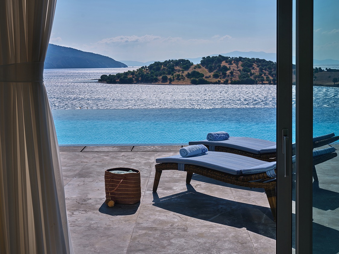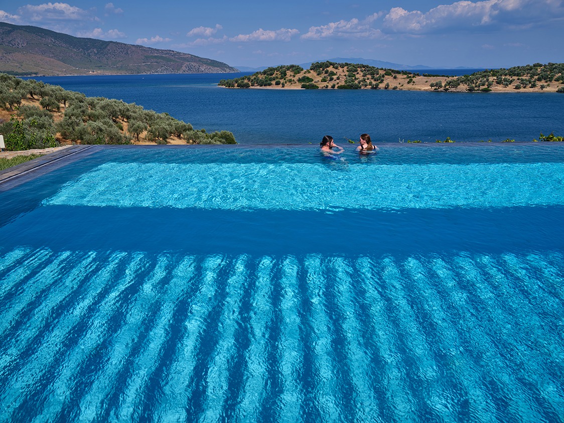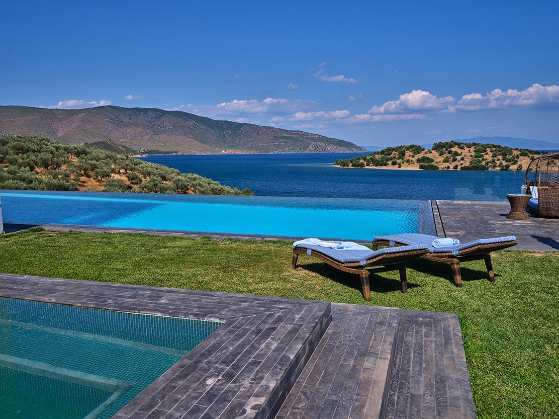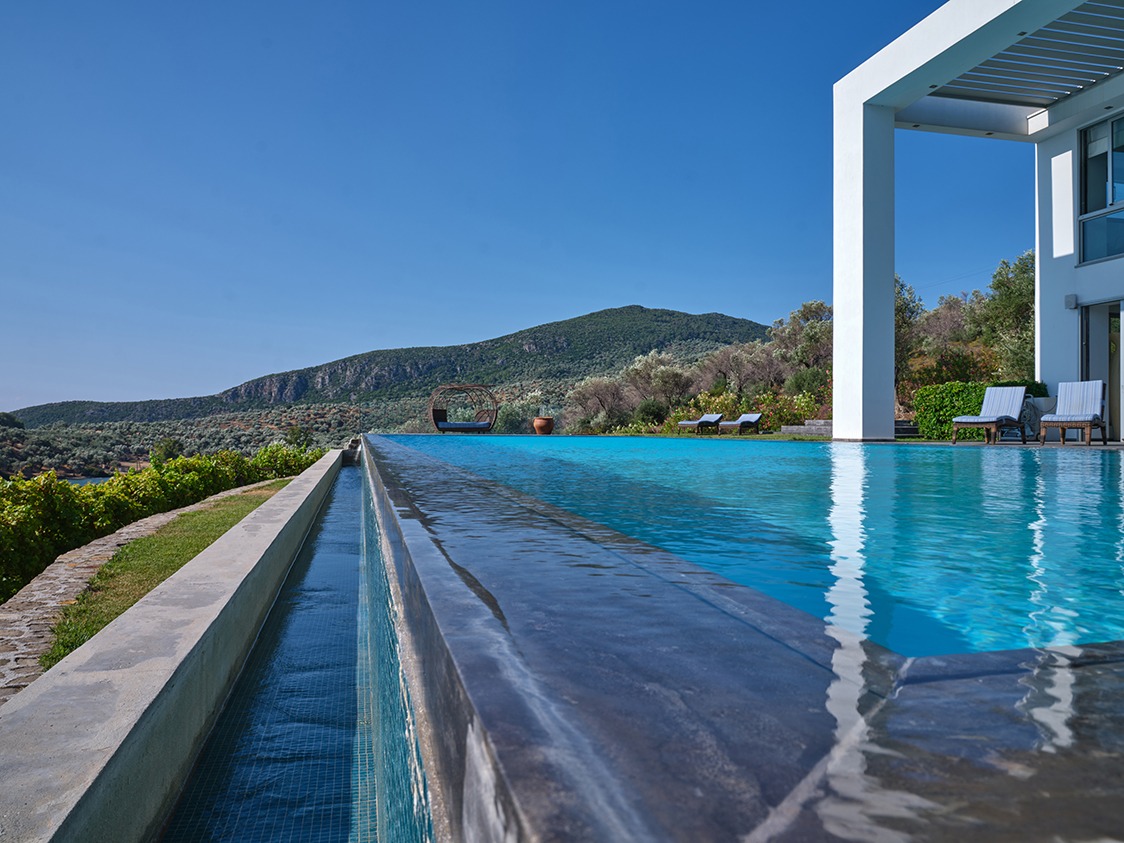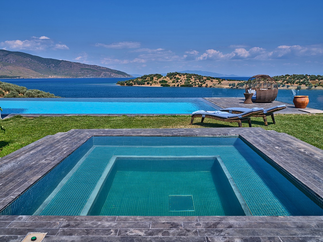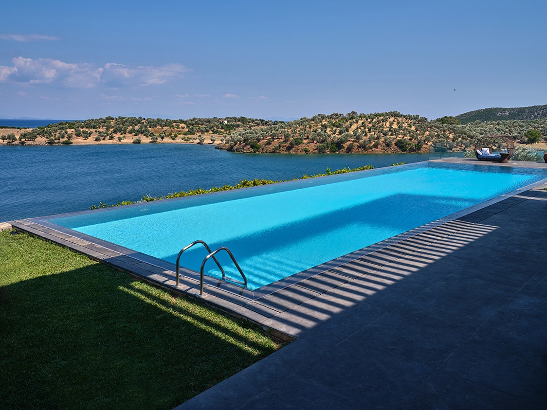 The infinity pool is catered for both professional sports training as well as recreational swimming. The water is 40% sea water and 60% sweet water. There is no need to add any chemicals as the pool system produces a natural chlorine effect from the salt of the seawater. Just by the pool there is a vast Jacuzzi that can accommodate up to 10 people.