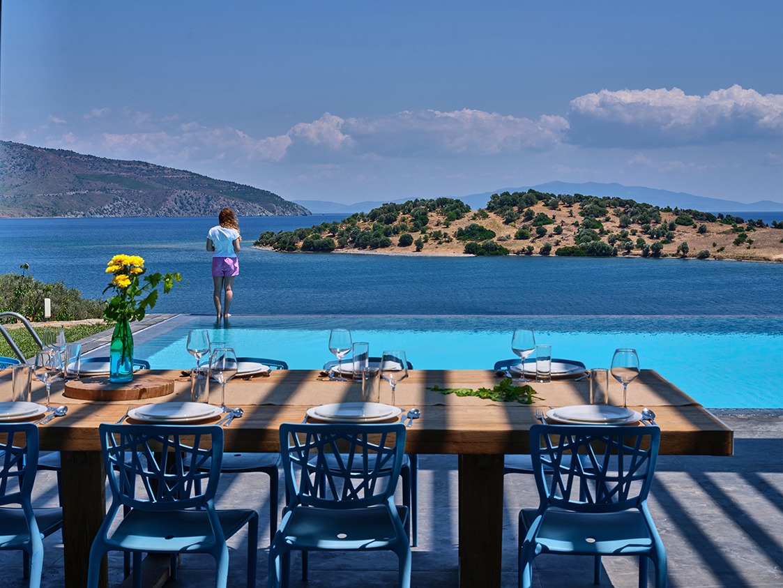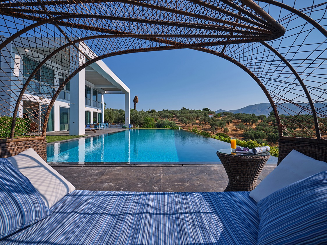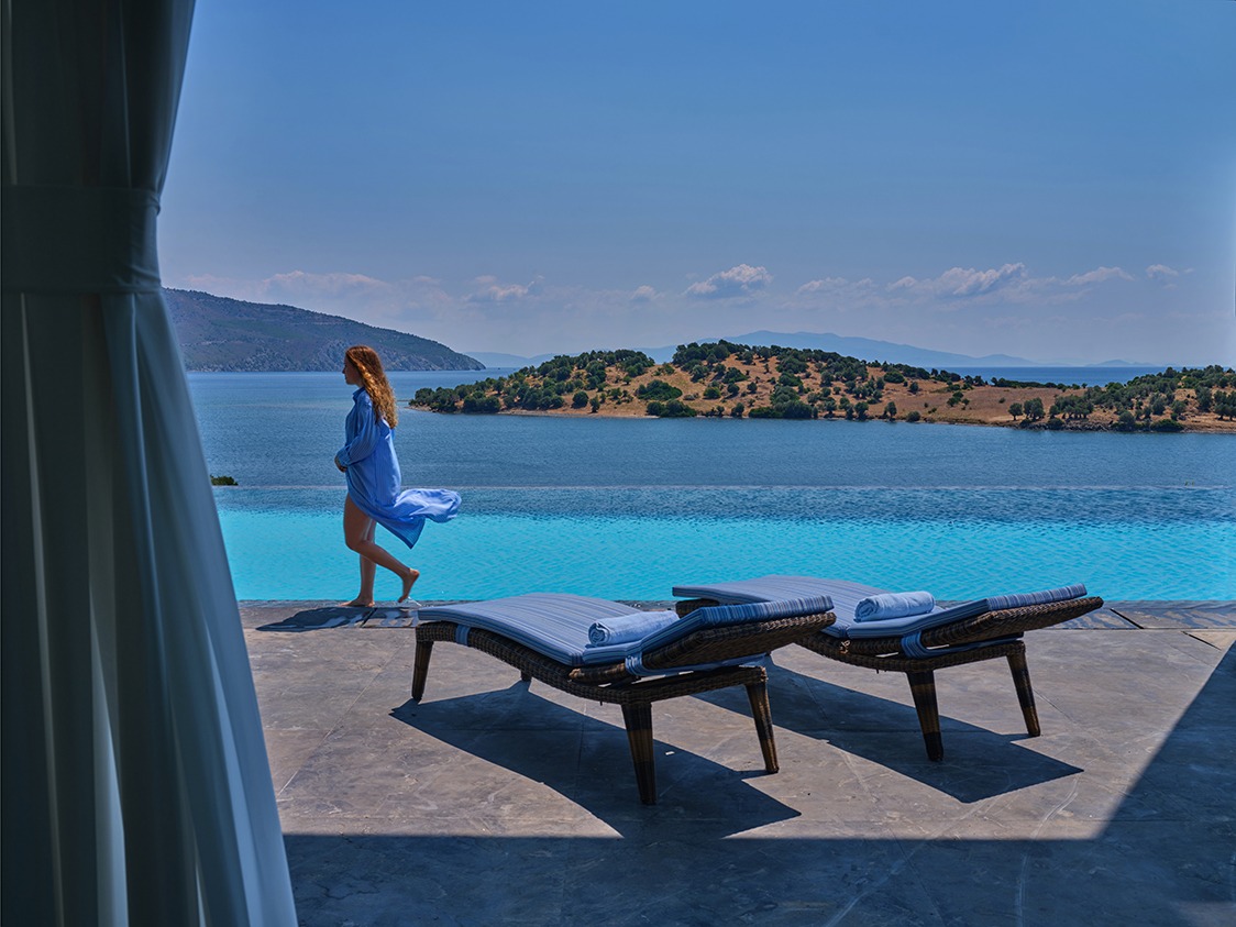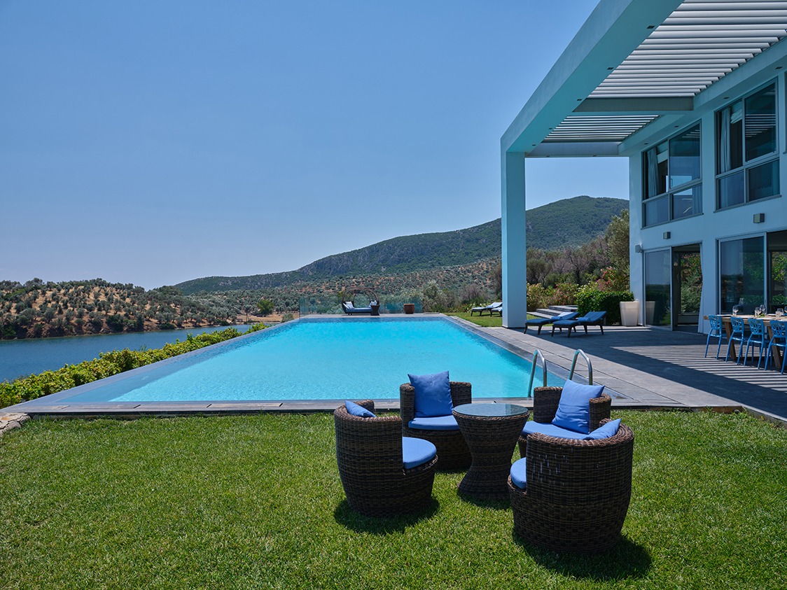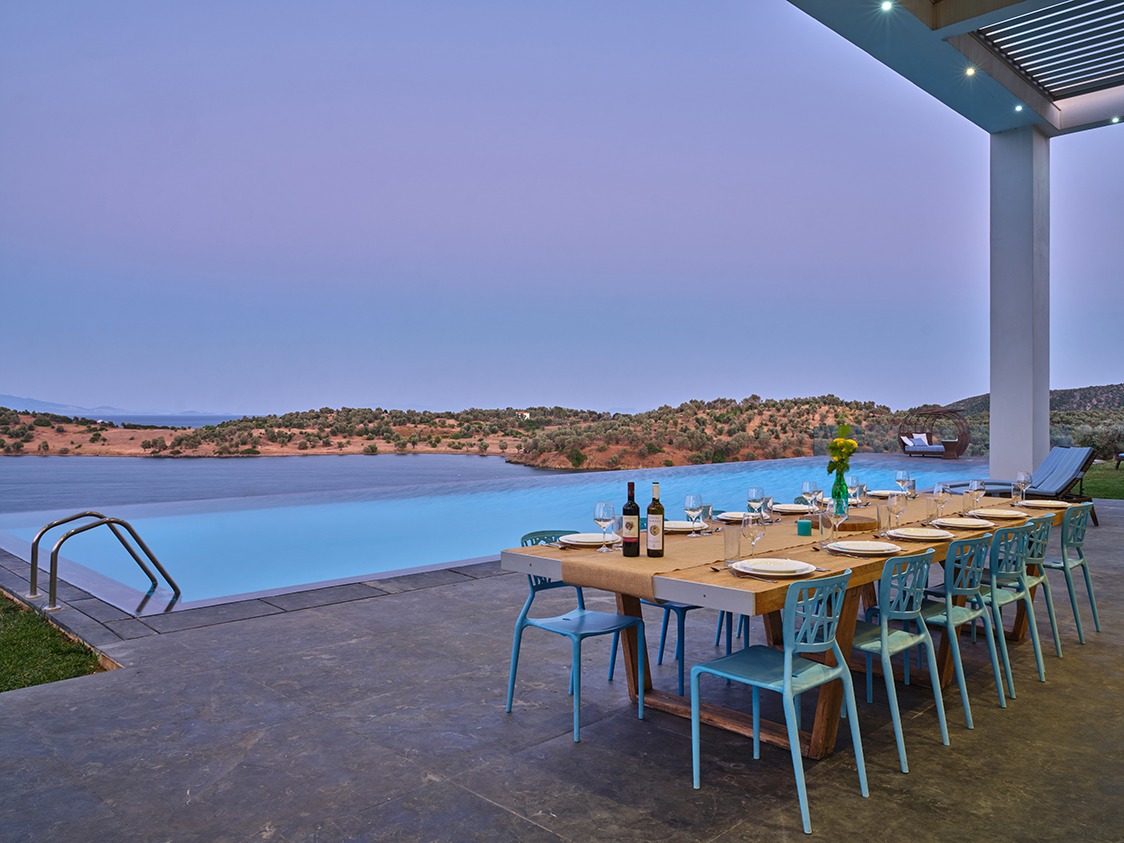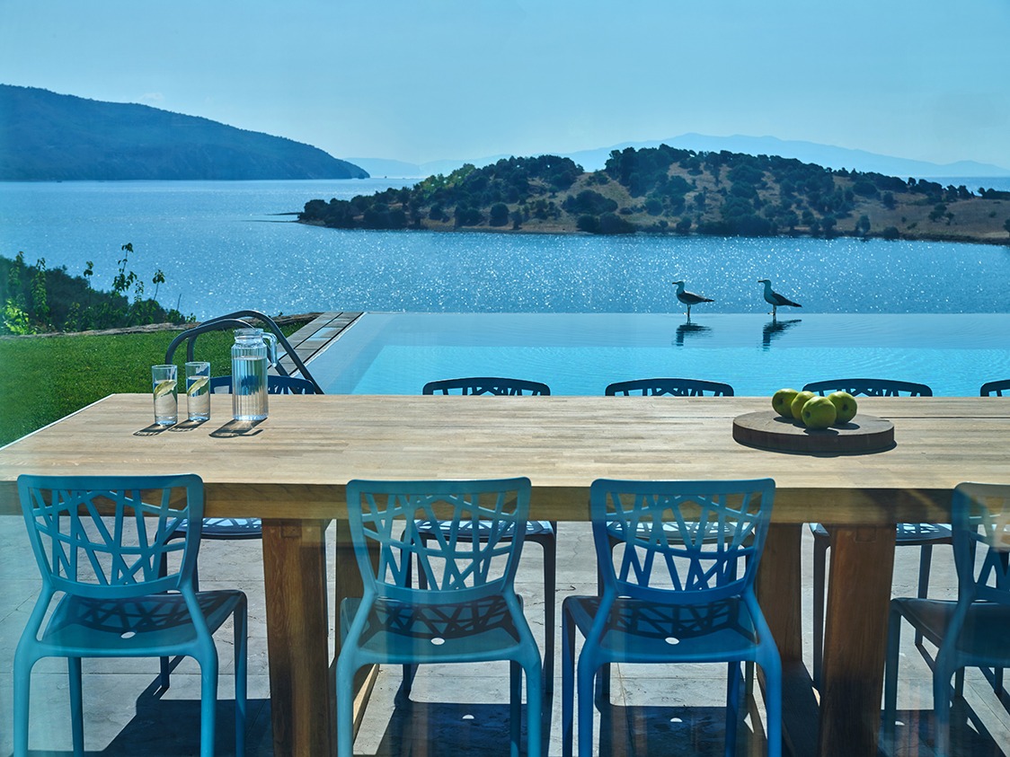The infinity pool is catered for both professional sports training as well as recreational swimming. The water is 40% sea water and 60% sweet water. There is no need to add any chemicals as the pool system produces a natural chlorine effect from the salt of the seawater. Just by the pool there is a vast Jacuzzi that can accommodate up to 10 people.